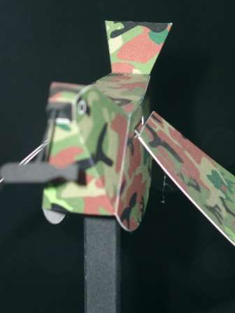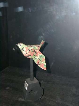 Das Motiv der Friedenstaube wurde militarisiert. Die Taube trägt Tarnfarben und eine Bombe im Schnabel. Keisuke Saka ist 1965 in Toyama/Japan geboren und hat mehrere mechanische Skulpturen aus Papier entwickelt. |
