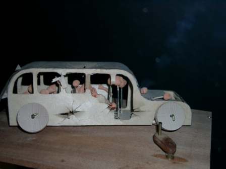 A bus is swaying by the hits of the missiles - and so do its passengers. The sculpture takes up an incident during the war against Yugoslavia: A bus, passing a bridge, was attacked by a missile of a Nato-bomber. Then the machine turned round and attacked the bus once more. Many people were killed. The officials told that the bridge was the target. The civilian deads were apologized as "collateral damages". The bridge had only little strategic value because it was not strong enough to carry tanks. ![]() |