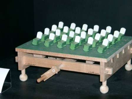 Paul Spooner ist einer der führenden Künstler mechanischer Skulpturen in England. Seine Skulptur "Ohne Titel" zeigt 24 Wiegen, die sich im Takt bewegen. Die Baldachine der Wiegen sind als Grabstein gehalten. Paul Spooner wurde 1948 geboren und lebt als Bildhauer in Stithians, Cornwall, im Südwesten Englands. |